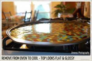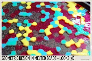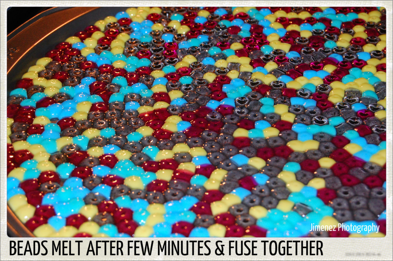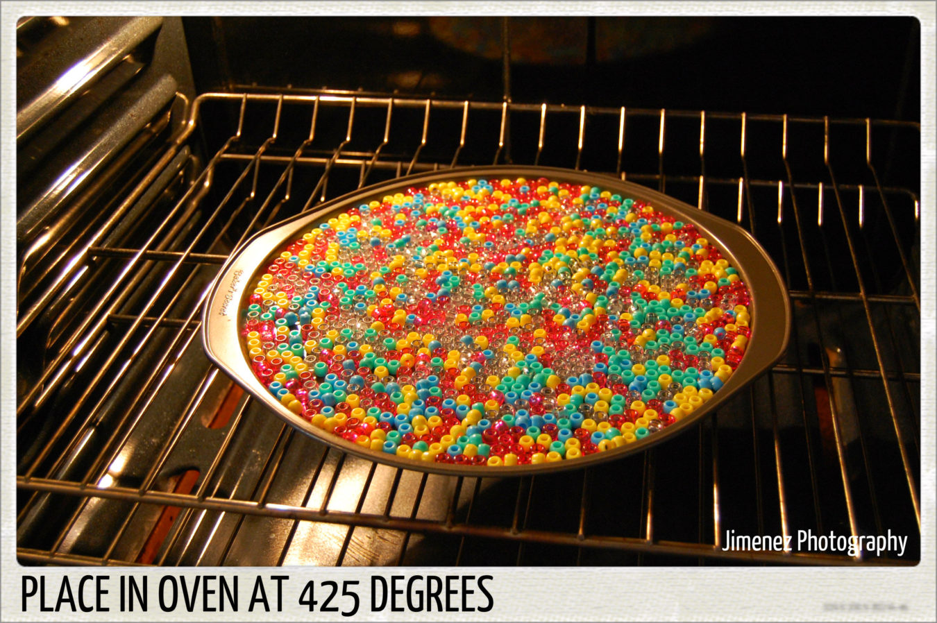 Once the top of your beads is flat, remove from the oven. Set pizza pan on top of the stove to cool. In a few minutes, you will hear the strangest cracking noise, but don’t fret, as this is just the plastic cooling and it is nothing to worry about.