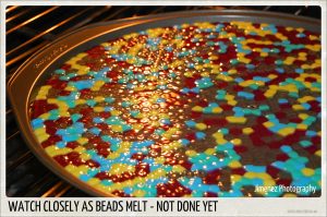 Set your oven to 425 degrees and get it nice and hot. Once your oven has heated up nicely, carefully place your pizza pan in the oven. Now the waiting begins. Since I have already done this type of craft project last year, I used our gas grill to cut down on any of the stinky smell from the beads melting, but today, I just opened up the windows and turned on the ceiling fan to rid any odor. Just so you know, the melting beads did not create much smell in the house, but since we are having a nice warm day for a change, having the windows open for fresh air was nice.