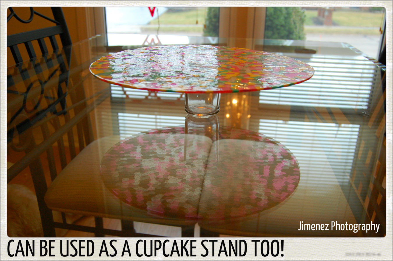 Also, while I was looking at the finished product on my table, I also thought that this would make a neat cupcake platter too! I would probably want a little stand on it, so I could head on over to the Dollar Store and purchase a glass short candle holder for $1 and glue it to the underneath center of the melted beads platter. Whala, instant cupcake stand!